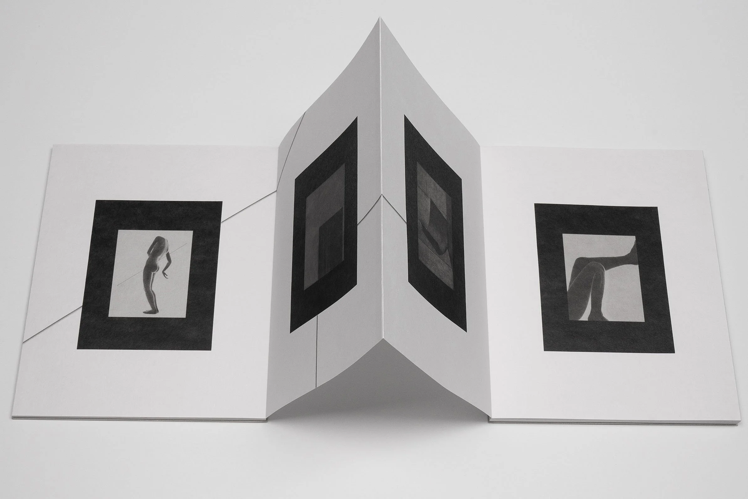 These geometric lines also extend into my exhibition installations — appearing in the framing and, at times, extending onto the gallery walls. Together with designer Tomasz Laczny, we carried this rhythm into the book’s design: its concertina fold and blind-debossed cover subtly echo the tactile nature of the etching process.